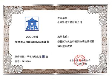 7月21日收到證書,北京崇建公司“崇禮區(qū)冬奧會(huì)特勤消防站建設(shè)項(xiàng)目BIM應(yīng)用成果”被評為2020年度北京市工程建設(shè)BIM單項(xiàng)應(yīng)用成果Ⅲ類。