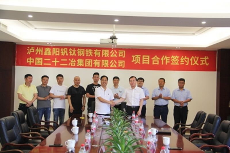 5月23日,中國二十二冶集團(tuán)與瀘州鑫陽釩鈦鋼鐵有限公司簽訂瀘州鑫陽釩鈦煉鋼項(xiàng)目合同。中國二十二冶集團(tuán)總經(jīng)理、黨委副書記朱曉飛,瀘州鑫陽釩鈦鋼鐵有限公司董事長劉義騰出席儀式并代表雙方簽約。