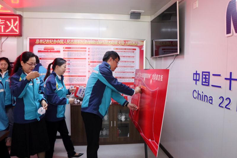 在“學(xué)黨史”環(huán)節(jié),項(xiàng)目黨支部書記講授偉大抗美援朝精神專題黨課,帶領(lǐng)與會(huì)人員重溫中國(guó)人民志愿軍建立的不朽歷史功勛,并由中國(guó)二十二冶集團(tuán)時(shí)代置業(yè)公司黨委書記趙曉暉發(fā)放學(xué)習(xí)書籍《誰(shuí)是最可愛(ài)的人》。在“悟思想”環(huán)節(jié),兩名優(yōu)秀黨員代表講解在抗美援朝戰(zhàn)役中革命英雄的感人事跡,全體與會(huì)黨員在心愿紙上寫下對(duì)黨說(shuō)的心里話和工作行動(dòng)目標(biāo),并將其粘貼在黨員踐行板上表明決心。在“辦實(shí)事”環(huán)節(jié),中國(guó)二十二冶集團(tuán)一公司黨委副書記趙海濤為與會(huì)黨員佩戴黨徽,通過(guò)此舉充分發(fā)揮黨員干部先鋒模范作用,帶領(lǐng)廣大員工扎根一線,確保項(xiàng)目履約;同時(shí)設(shè)立黨員責(zé)任區(qū),中國(guó)二十二冶集團(tuán)設(shè)計(jì)院黨委副書記劉軍分別為開(kāi)發(fā)、設(shè)計(jì)、施工三方黨員代表授牌,黨員代表作表態(tài)發(fā)言。在“開(kāi)新局”環(huán)節(jié),項(xiàng)目管理人員帶領(lǐng)參會(huì)人員參觀施工現(xiàn)場(chǎng),重點(diǎn)講解開(kāi)發(fā)設(shè)計(jì)理念、施工中運(yùn)用智慧化建造手段貫徹綠色施工理念的典型實(shí)踐和取得的重要成果。