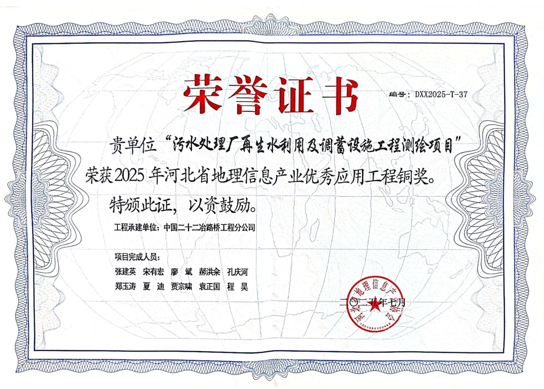 近日獲悉,在河北省地理信息產(chǎn)業(yè)協(xié)會(huì)主辦的權(quán)威評(píng)選中,路橋公司憑借“污水處理廠再生水利用及調(diào)蓄設(shè)施工程測(cè)繪項(xiàng)目”的卓越實(shí)踐,榮獲“2025年河北省地理信息產(chǎn)業(yè)優(yōu)秀應(yīng)用工程銅獎(jiǎng)”。